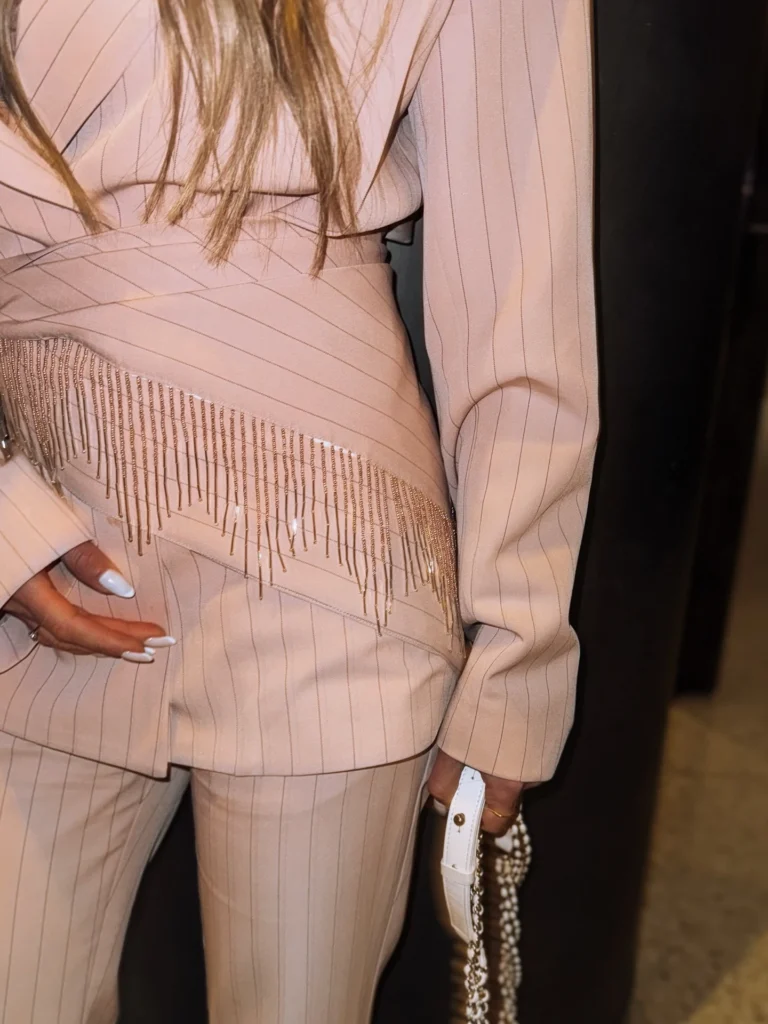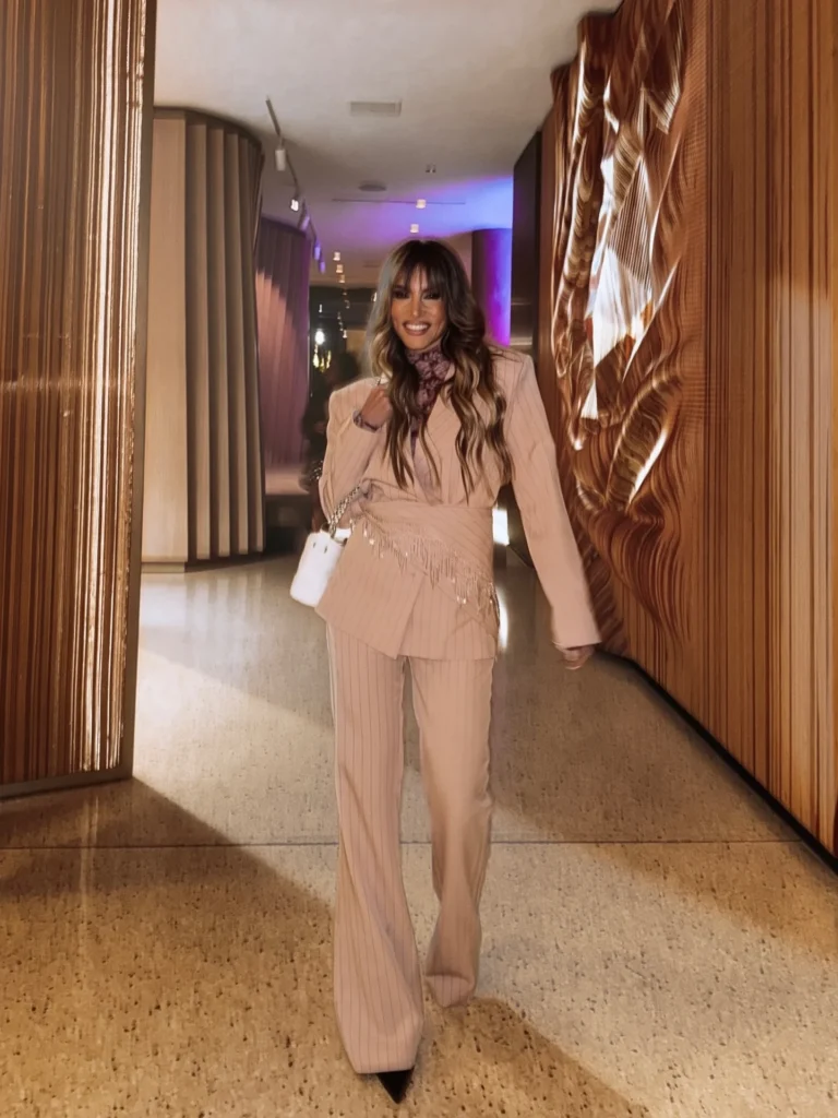 Σε πρόσφατες φωτογραφίες της, η Αθηνά Οικονομάκου μας καθηλώνει με μια εξαιρετικά σικ εμφάνιση στο Μιλάνο. Φορώντας ένα υπέροχο, ανοιχτό ροζ-σομόν κοστούμι με λεπτή ρίγα, αποδεικνύει για άλλη μια φορά ότι η μόδα είναι το στοιχείο της. Το wrap σακάκι με τα κρόσσια στη μέση έδινε έναν αέρα εκλέπτυνσης, ενώ το printed ζιβάγκο πρόσθετε μια μοντέρνα πινελιά. Είτε στέκεται σε έναν εσωτερικό χώρο, ακουμπισμένη σε κολώνα με μια λευκή τσάντα με αλυσίδα, είτε κάθεται στο καπό μιας πολυτελούς μαύρης Porsche, το στυλ της παραμένει απαράμιλλο.