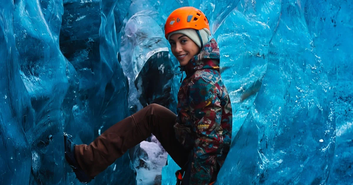 Εκτός από την απαιτητική ορειβασία, η ηθοποιός και η παρέα της εξερεύνησαν τις εντυπωσιακές παγοσπηλιές (ice caves) του παγετώνα. Μάλιστα, μοιράστηκε και ένα ενδιαφέρον «fun fact» με τους διαδικτυακούς της φίλους, εξηγώντας πως το έντονο μπλε χρώμα στις σπηλιές δημιουργείται επειδή ο πάγος είναι τόσο πυκνός που απορροφά όλα τα άλλα χρώματα του φωτός εκτός από το μπλε!