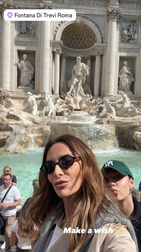 Σε ένα από τα πιο εντυπωσιακά της στιγμιότυπα, η παρουσιάστρια ποζάρει μπροστά από την εμβληματική Fontana Di Trevi. Με το αψεγάδιαστο, casual chic στυλ της, φορώντας μαύρα γυαλιά ηλίου και ένα κομψό παλτό, έγραψε στη λεζάντα «Make a wish» (Κάνε μια ευχή), τηρώντας προφανώς το διάσημο έθιμο με το νόμισμα στο συντριβάνι.
