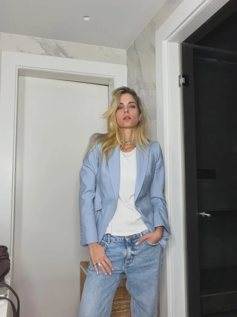 Casual chic ντύσιμο την άνοιξη με ανοιχτόχρωμο τζιν, λευκό t-shirt και baby blue blazer από τη Δούκισσα Νομικού.
