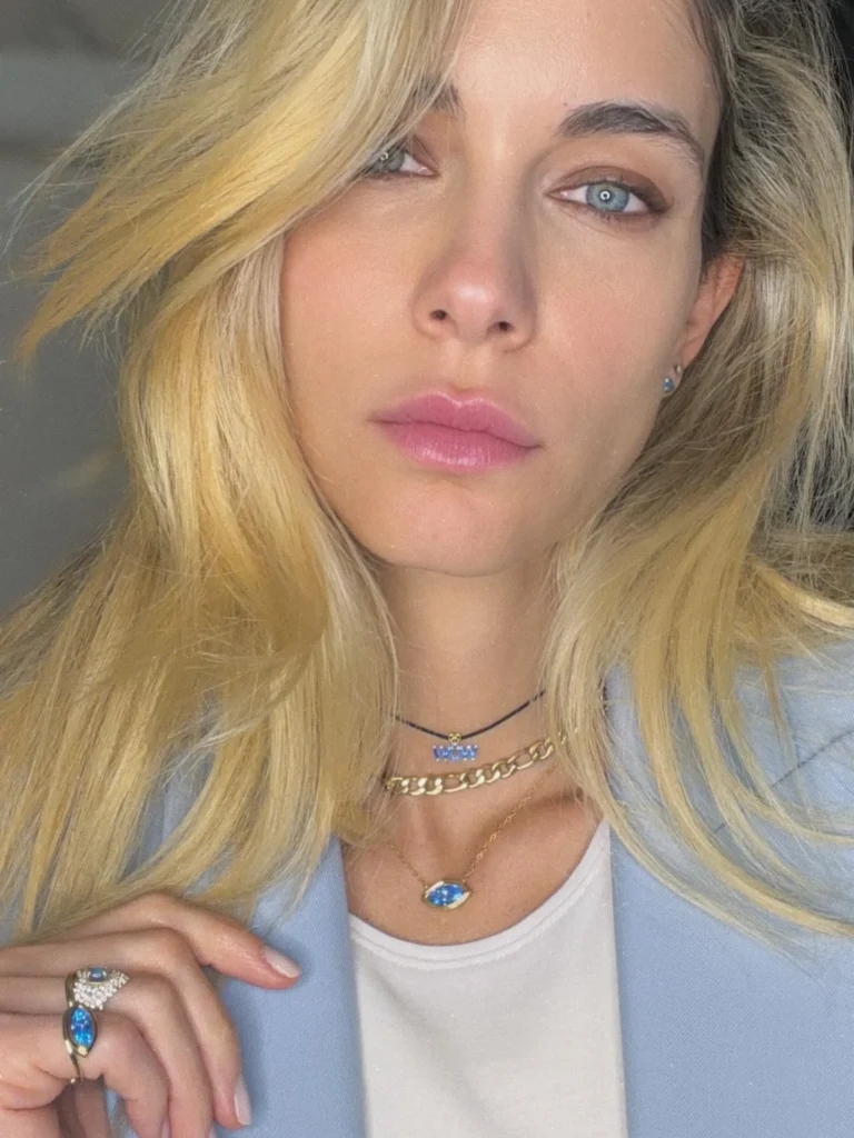 Το σύνολο απογειώνεται με το έξυπνο layering στα κοσμήματα. Χρυσές αλυσίδες, διακριτικά τσόκερ με μπλε λεπτομέρειες και μενταγιόν σε σχήμα ματιού, δένουν αρμονικά με το χρώμα του σακακιού και προσθέτουν μια παιχνιδιάρικη πολυτέλεια.